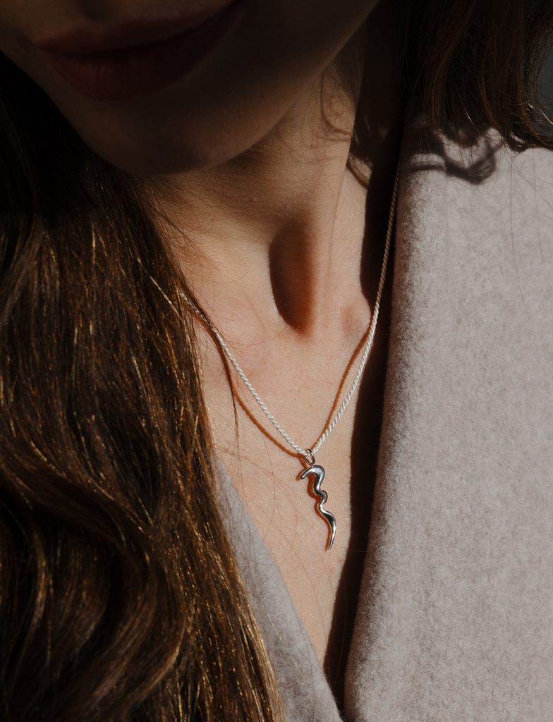 Dizajn decentne srebrne ogrlice iz kolekcije Laboratory Adéle Pečlove temelji se na istom obliku kao naušnice CLAREA iz ove kolekcije, inspirirane stilizacijom VUCH loga…