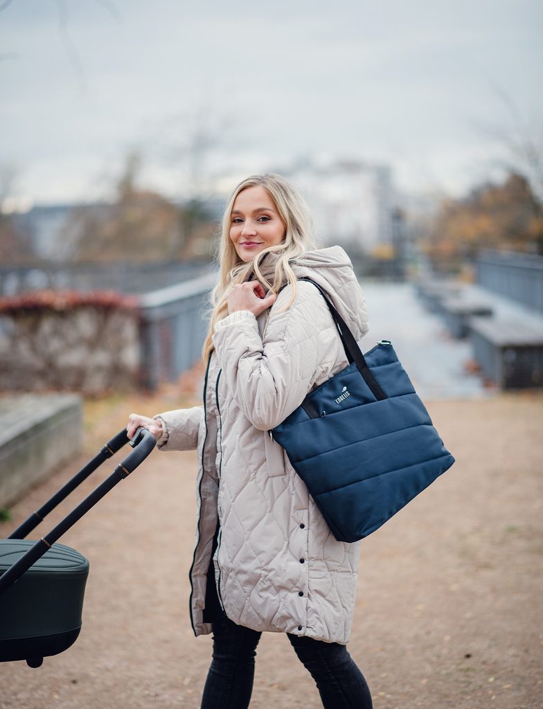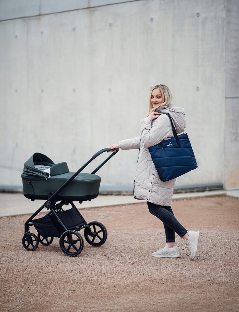 Podstavljena prošivena torba koja podnosi tempo svakodnevnog dana. Zahvaljujući širokim ručkama dobro se nosi i kada imate jednu ruku na kolicima, a drugu punu stvari. Gornji zatvarač drži na sigurnom rezervnu odjeću, užinu i sitnice koje tijekom dana neprestano premještate. Mekana, udobna i praktična za svaki izlazak.